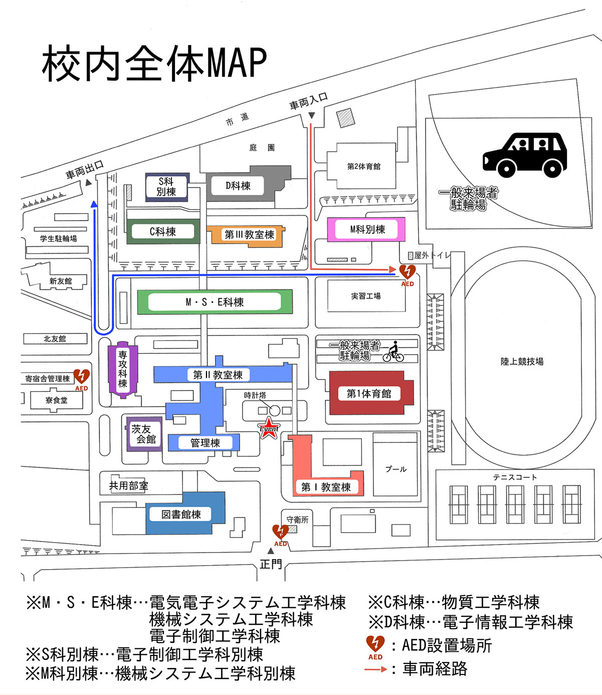 お車でお越しの方は、→(赤矢印)のようにグラウンド側の裏門からご入場いただき、お帰りの際は→(青矢印)のように寮宿舎側の裏門からご出場いただくようお願いいたします。