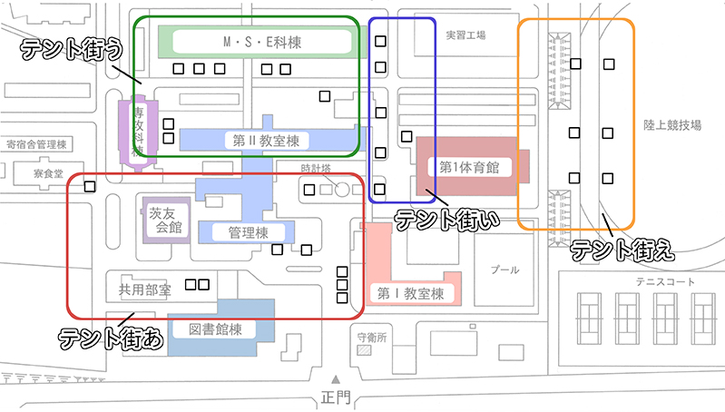 - ページ最下部には校内マップとテント街マップがあります。迷ったときにご活用ください。